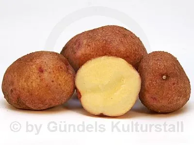 Schale: | gelbrosa und glatt mit roten Flecken, mitteltiefe Augen | |