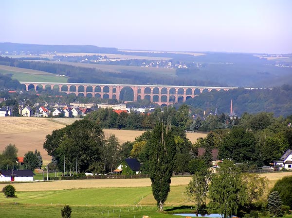 Verlassen wir den Hof in Richtung alte Staatsstraße, so erblicken wir die monumentale Göltzschtalbrücke, ein Meisterwerk deutscher Architektur und das bekannteste Wahrzeichen des Vogtlandes. In 78m Höhe überspannt die größte Ziegelsteinbrücke der Welt das Göltzschtal auf über 500 m Länge. Sie ist heute ein beliebter Anziehungspunkt zahlreicher Touristen aus aller Welt.